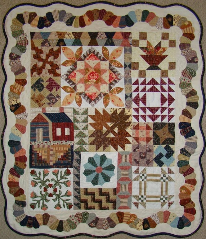This image showcases a beautifully crafted quilt featuring a variety of intricate patchwork designs, including floral patterns and geometric shapes.