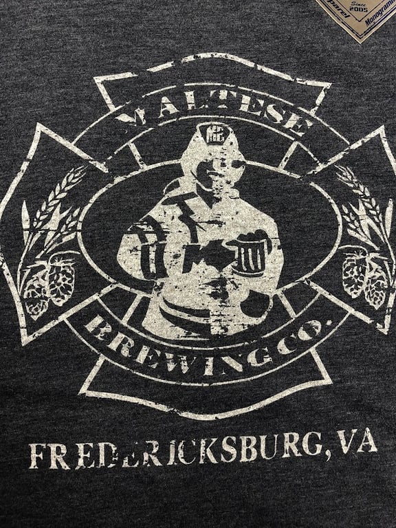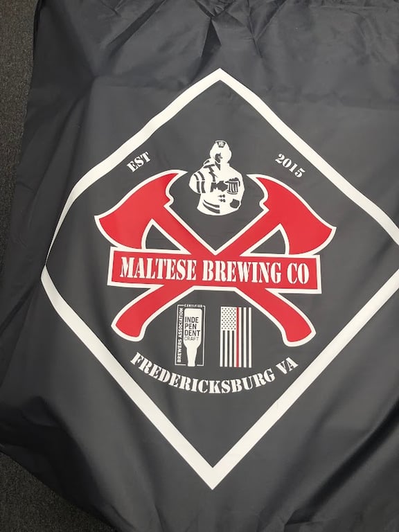 The image features a large, black bag with a bold logo for Maltese Brewing Co., showcasing crossed axes and a figure.