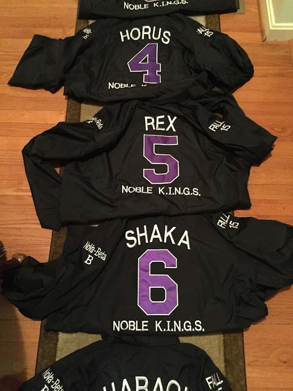 The image features several black jackets laid out on a wooden floor, each displaying a name and number in purple and white. The jackets are part of a team called "Noble K.I.N.G.S.