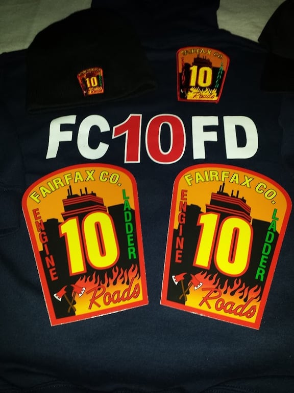 The image features a navy hoodie adorned with vibrant patches displaying "Fairfax Co. Engine 10" and "Ladder 10," along with matching beanies.