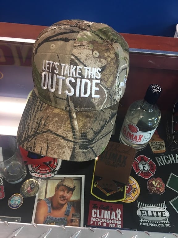 A camo cap with the phrase "LET'S TAKE THIS OUTSIDE" is displayed on a counter alongside various stickers, a photo of a man in overalls, and a bottle of Climax moonshine.