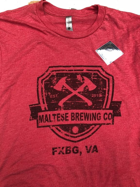 A red t-shirt featuring the Maltese Brewing Co. logo with crossed axes is displayed prominently. The shirt is laid flat, showcasing its design and texture.