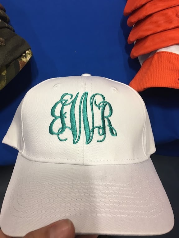 A white cap with a teal embroidered monogram is prominently displayed in the foreground, surrounded by various colorful hats.