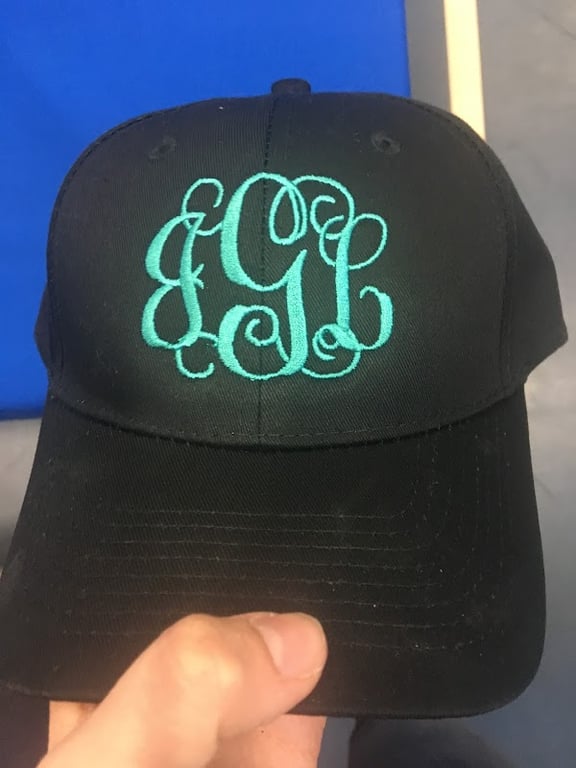 A black cap featuring intricate turquoise embroidery of the initials "JGL" is held in a hand.