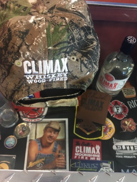The image features a camouflage cap with "CLIMAX WHISKEY WOOD-FIRED" embroidered on it, surrounded by various patches and memorabilia.