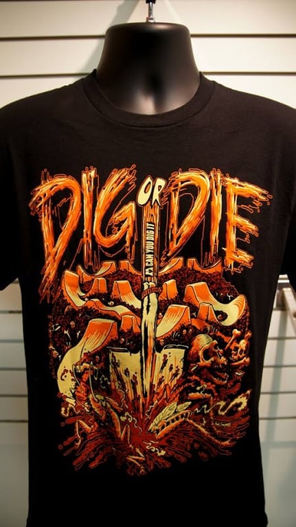 The image features a black T-shirt displayed on a mannequin, showcasing a vibrant graphic design with the text "DIG OR DIE.