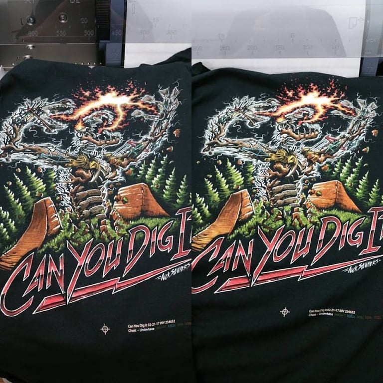 The image features a black t-shirt displaying a vibrant graphic design with the text "Can You Dig It?" and an illustration of a tree figure amidst a forest backdrop.