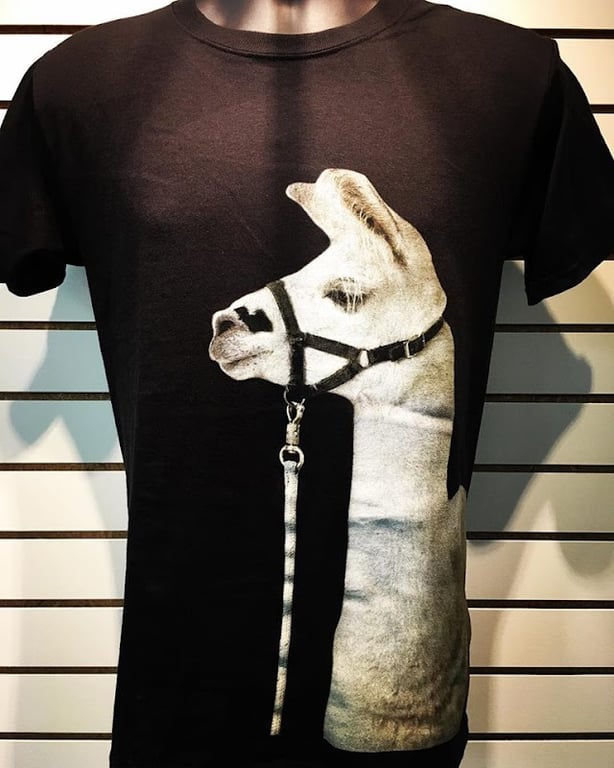 A black t-shirt featuring a whimsical graphic of a llama's head with a halter is displayed on a mannequin against a slat wall.