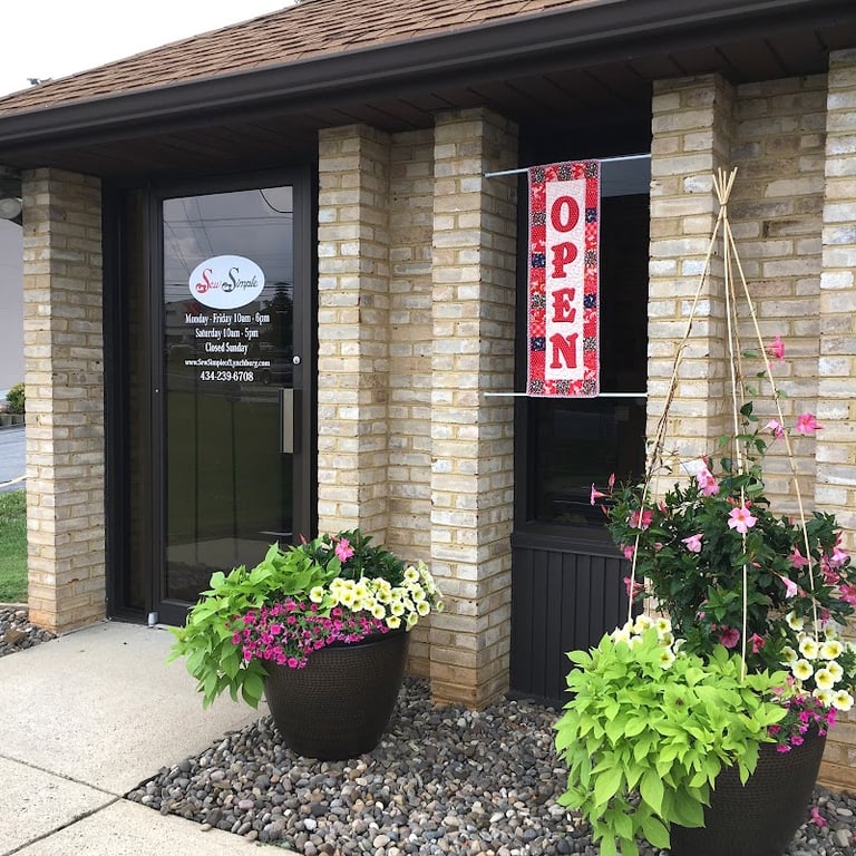 The image shows the exterior of Sew Simple of Lynchburg LLC, featuring a welcoming "OPEN" sign and vibrant flower pots.