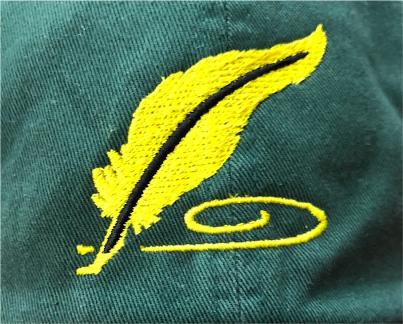 The image features a close-up of a green fabric item adorned with a vibrant yellow embroidered feather design.