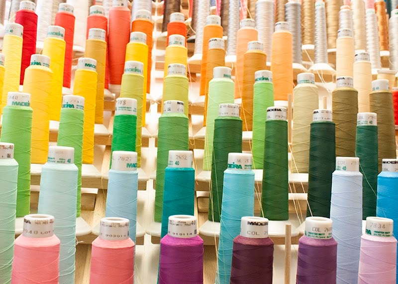 The image showcases a vibrant display of sewing thread spools in various colors, neatly arranged on wooden shelving.