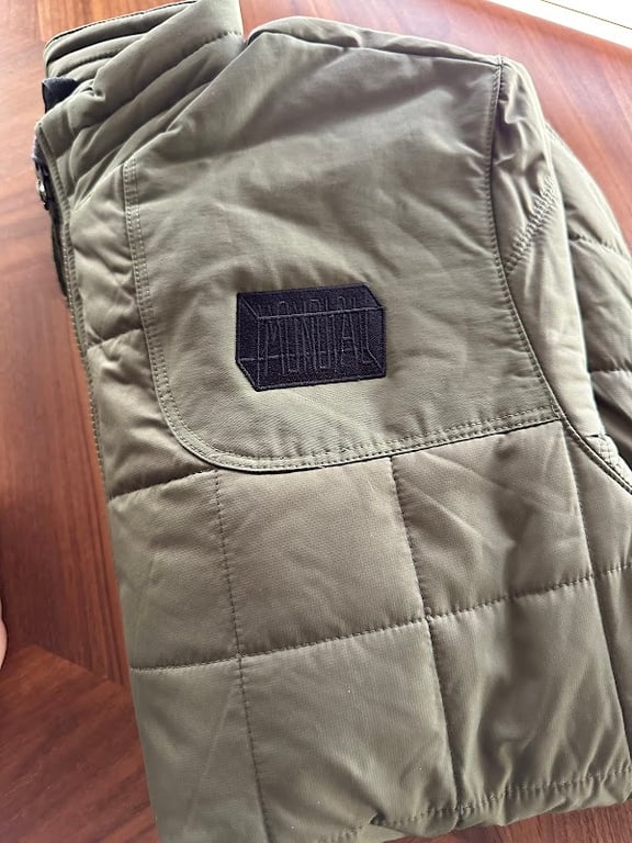 The image features a close-up of a quilted, olive-green jacket with a black logo patch. The jacket is laid on a wooden surface, highlighting its texture and design.