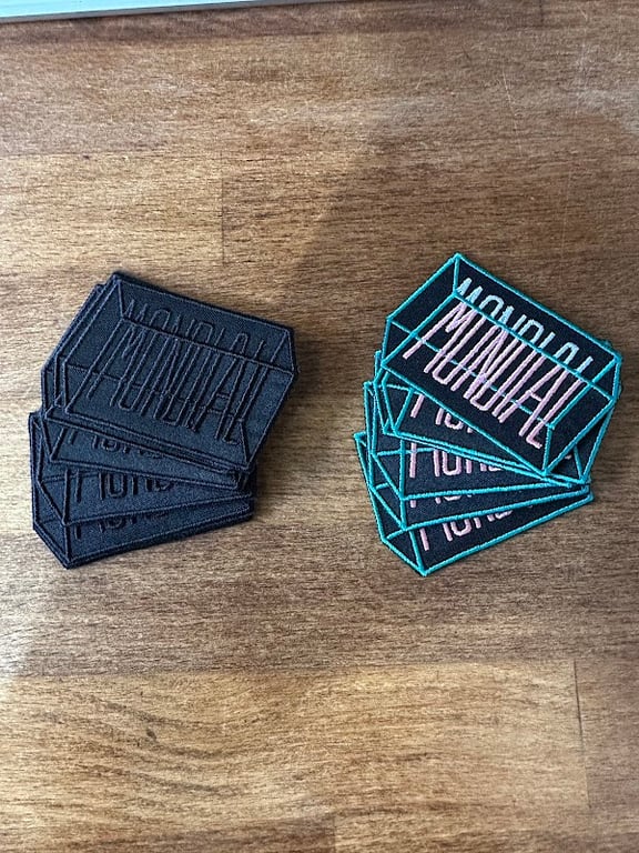 The image features two stacks of embroidered patches in black and teal, showcasing the brand "Mundial.