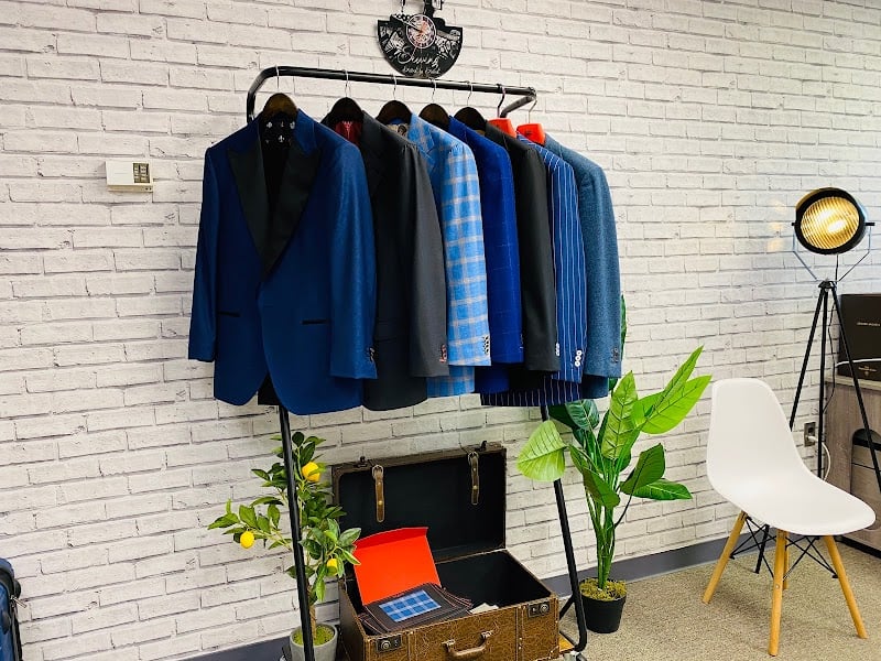 A display of tailored jackets hangs on a rack against a textured white wall, showcasing various fabrics and colors.