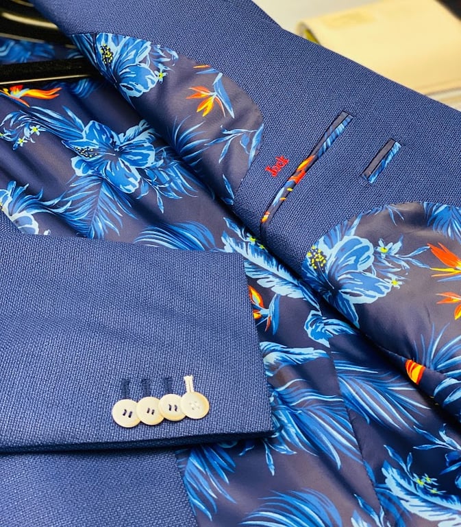 A vibrant blue jacket features a floral-patterned lining in shades of blue, orange, and green.