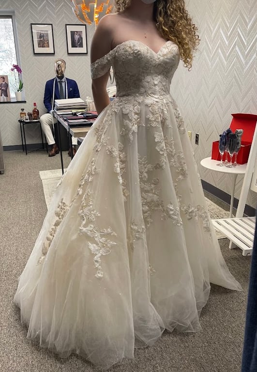 A woman models a stunning off-the-shoulder wedding gown adorned with intricate floral embroidery in a stylish sewing store.