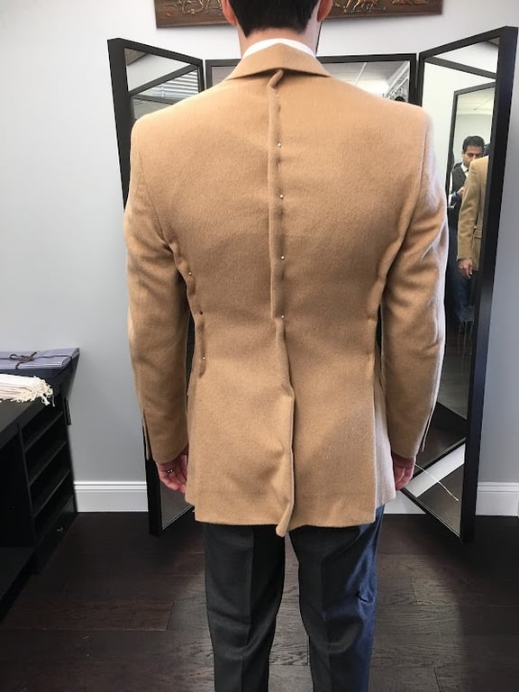 A man is wearing a tailored tan coat with visible pins along the back, standing in front of mirrors in a sewing store.