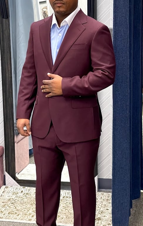 A man stands in a fitting room wearing a tailored burgundy suit with a light blue shirt.