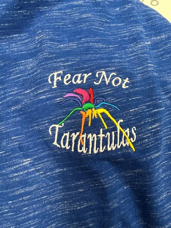 The image features a close-up of a blue fabric with colorful embroidery that reads "Fear Not Tarantulas.