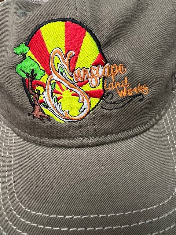 The image features a close-up of a brown cap adorned with a vibrant embroidered logo.