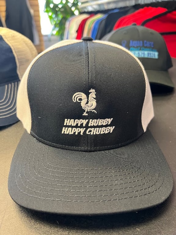 A close-up of a black and white cap featuring the embroidered text "Happy Hubby Happy Chubby" alongside a rooster design.