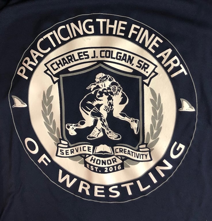 The image features a navy blue t-shirt displaying a wrestling-themed graphic.