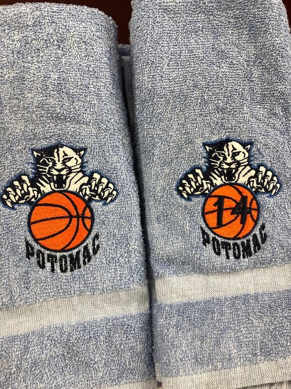 The image features two blue towels embroidered with a basketball design and the name "Potomac.