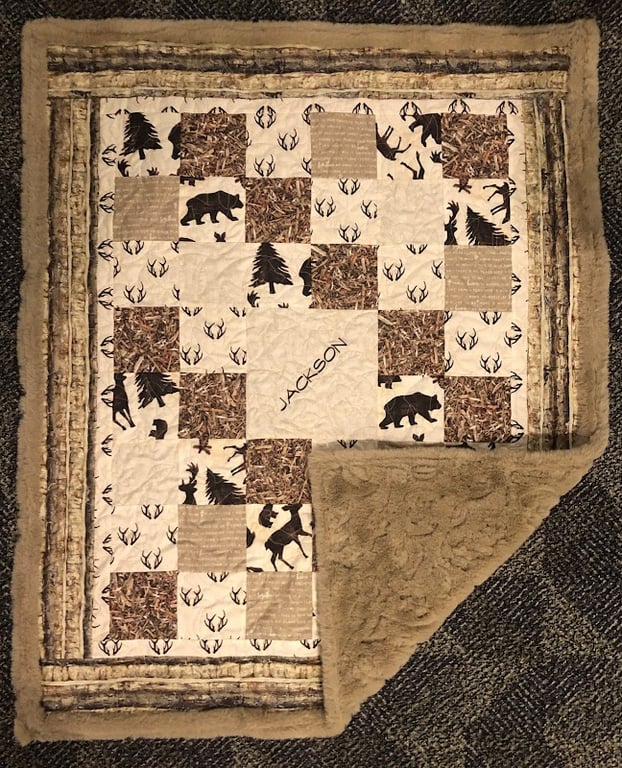 This image features a cozy quilt showcasing a patchwork design with nature-themed prints, including bears and trees.