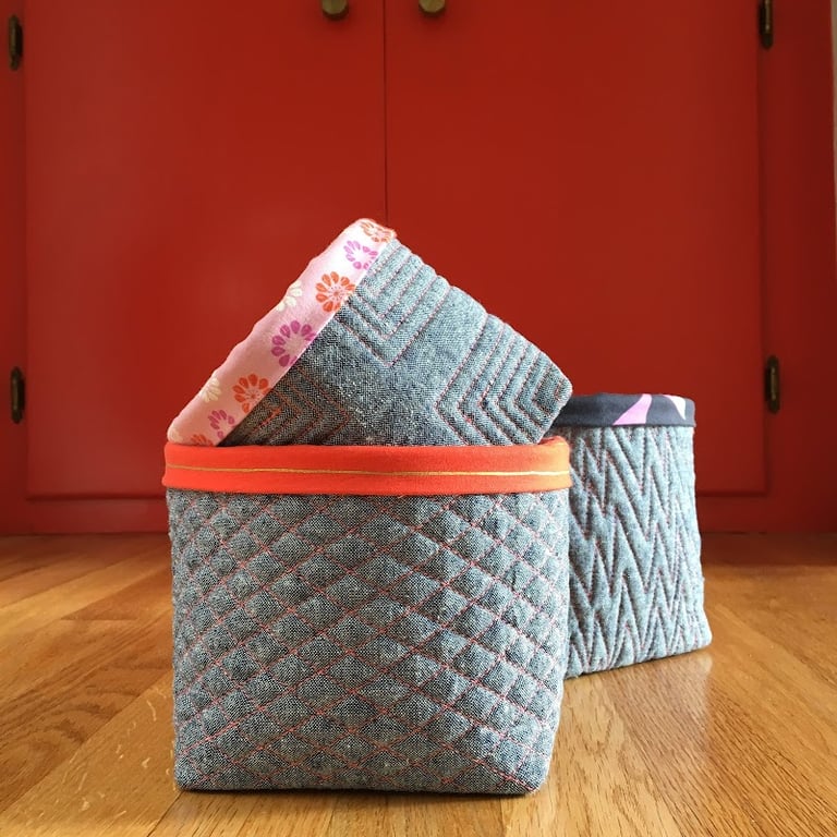 The image features colorful, quilted fabric storage baskets in various sizes, showcasing intricate patterns and vibrant trims.