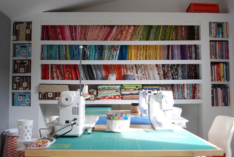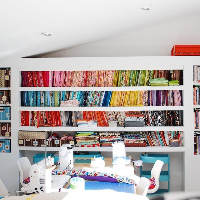 The image showcases a vibrant sewing store interior with colorful fabric neatly arranged on white shelves.