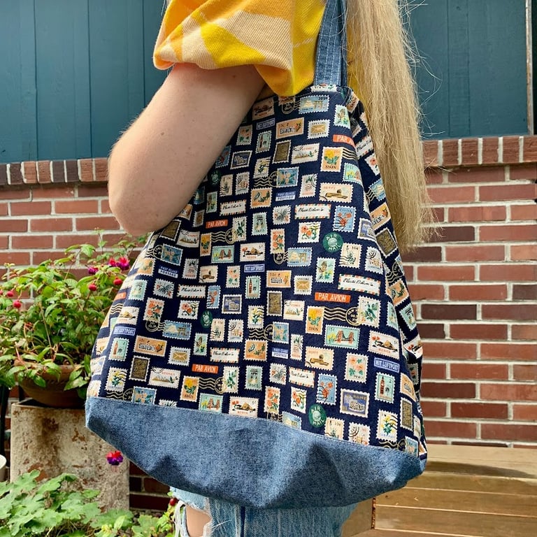 A person holds a colorful, patterned tote bag featuring a stamp design, showcasing the creativity of handmade sewing projects.