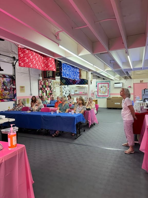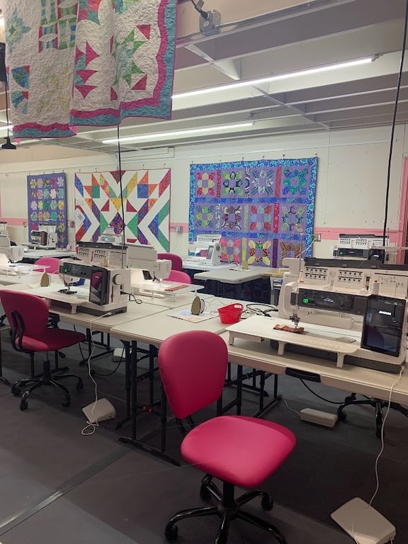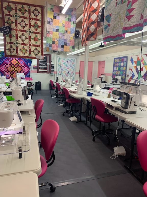 The image shows the interior of Annie's Quilt Shoppe, featuring rows of sewing machines on white tables with pink chairs.