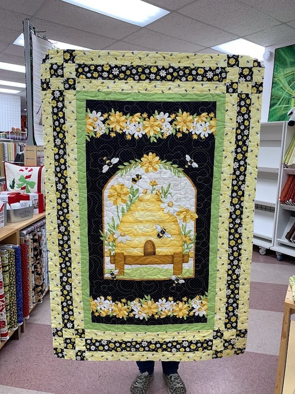 A vibrant quilt featuring a bee and flower design is displayed in Annie's Quilt Shoppe.