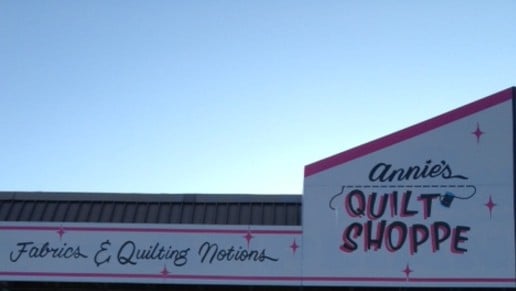 The image shows the exterior of Annie's Quilt Shoppe, featuring a colorful sign that reads "Annie's Quilt Shoppe" along with "Fabrics & Quilting Notions.