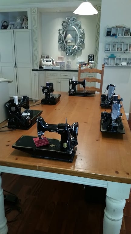 A spacious sewing studio features a wooden table with multiple vintage sewing machines, each set up with colorful fabric swatches.