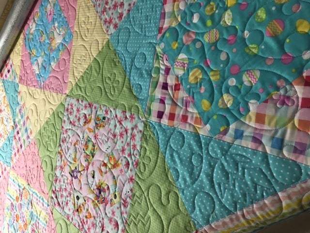 A vibrant quilt features a patchwork of pastel colors and playful patterns, including floral and polka dot designs. The textured stitching adds depth, showcasing the craftsmanship.