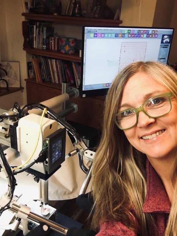 A woman with long hair and green glasses smiles in a sewing studio, showcasing a quilting machine and a computer monitor displaying design software.