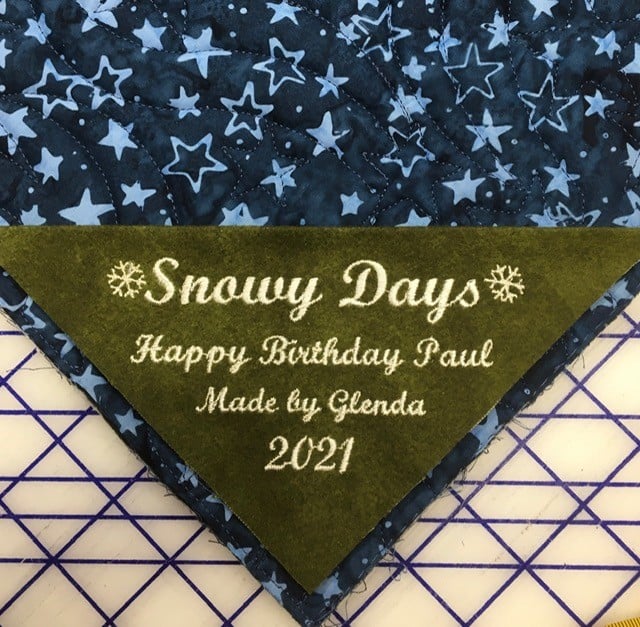 A beautifully quilted fabric features a dark blue background adorned with light blue stars. The corner displays an embroidered label reading "Snowy Days," celebrating a birthday.