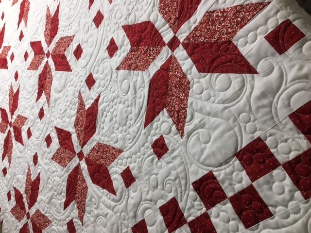 A vibrant quilt features intricate red and white patterns, showcasing detailed stitching and a mix of geometric shapes.