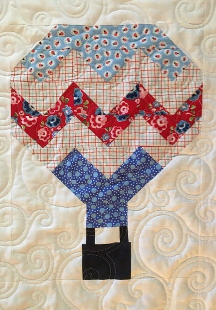 A colorful quilted hot air balloon design features various patterned fabrics in red, blue, and floral prints.