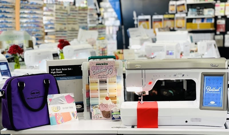 The image showcases a well-organized sewing store interior featuring a variety of sewing machines, colorful spools of thread, and quilting accessories.