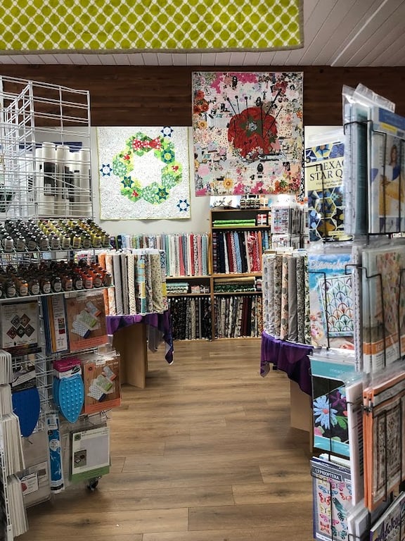 The Quilters Cafe features a bright, spacious interior filled with colorful fabric rolls and quilting supplies.