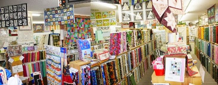 The image shows the interior of Gee Gee's Quilting Inc, featuring colorful rolls of fabric displayed on shelves alongside quilting patterns and supplies.
