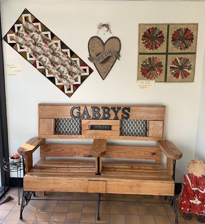 The image shows a welcoming interior of Gabby's Sewing & More, featuring a wooden bench with the store's name.