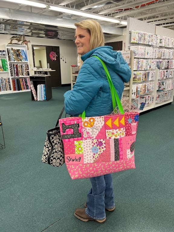A woman in a blue jacket carries a large, colorful sewing tote bag while browsing Gabby's Sewing & More. The store features shelves filled with fabrics and sewing supplies.