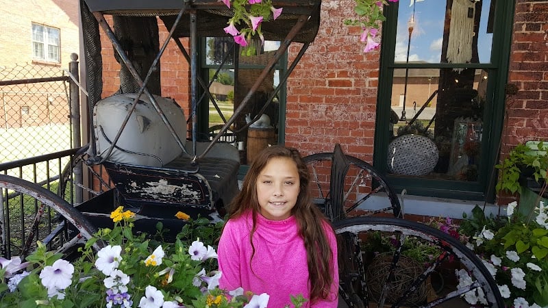 A young girl sits in front of a vintage horse-drawn carriage surrounded by colorful flowers.