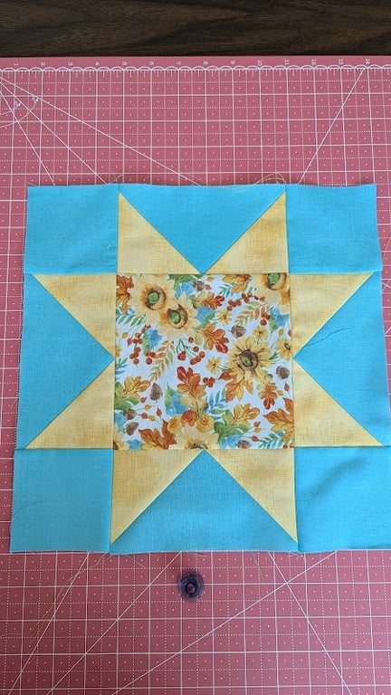 A vibrant quilt block features a floral center surrounded by turquoise and yellow fabric, set against a pink cutting mat.