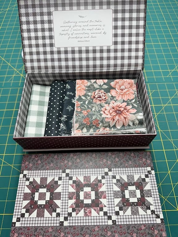 The image features a beautifully arranged fabric box from Kelly’s Quilts LLC, showcasing various patterned fabrics, including floral and checkered designs.