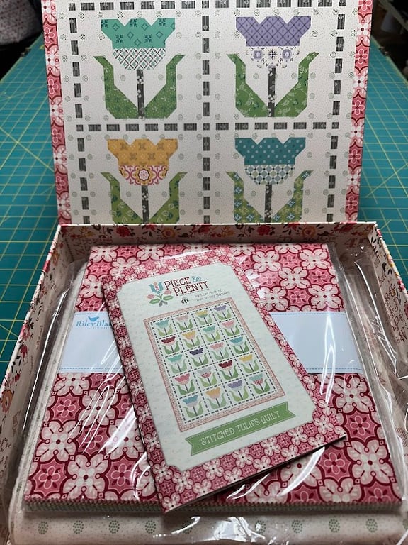 The image showcases a beautifully designed quilt kit from Kelly’s Quilts LLC, featuring vibrant floral fabrics and a pattern booklet titled "Stitched Tulips Quilt.