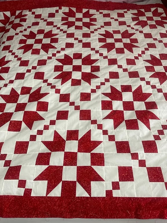The image showcases a beautifully crafted quilt featuring a striking red and white star pattern. The quilt is displayed flat, highlighting its intricate design and craftsmanship.